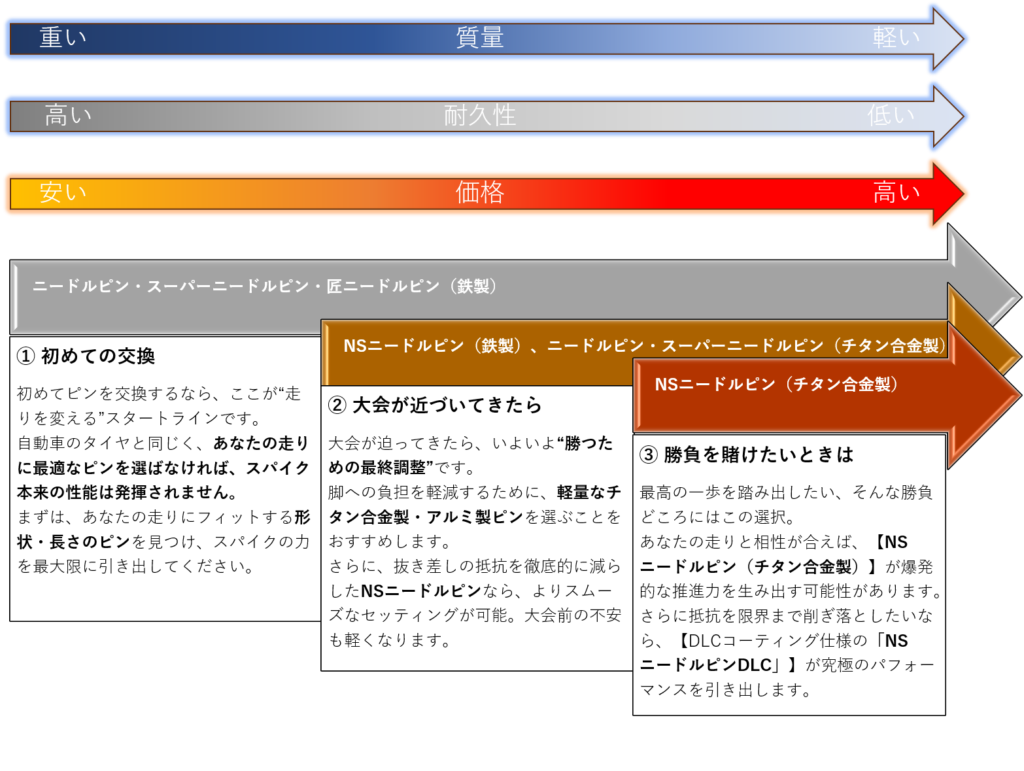 接地時のピンの抵抗を減らしたいなら、NS処理をしたNSニードルピンやNSスーパーニードルピンが効果的です。接地時の地面の食いつきを保ちながら、スムーズなけり出しをサポートする設計を行っております。