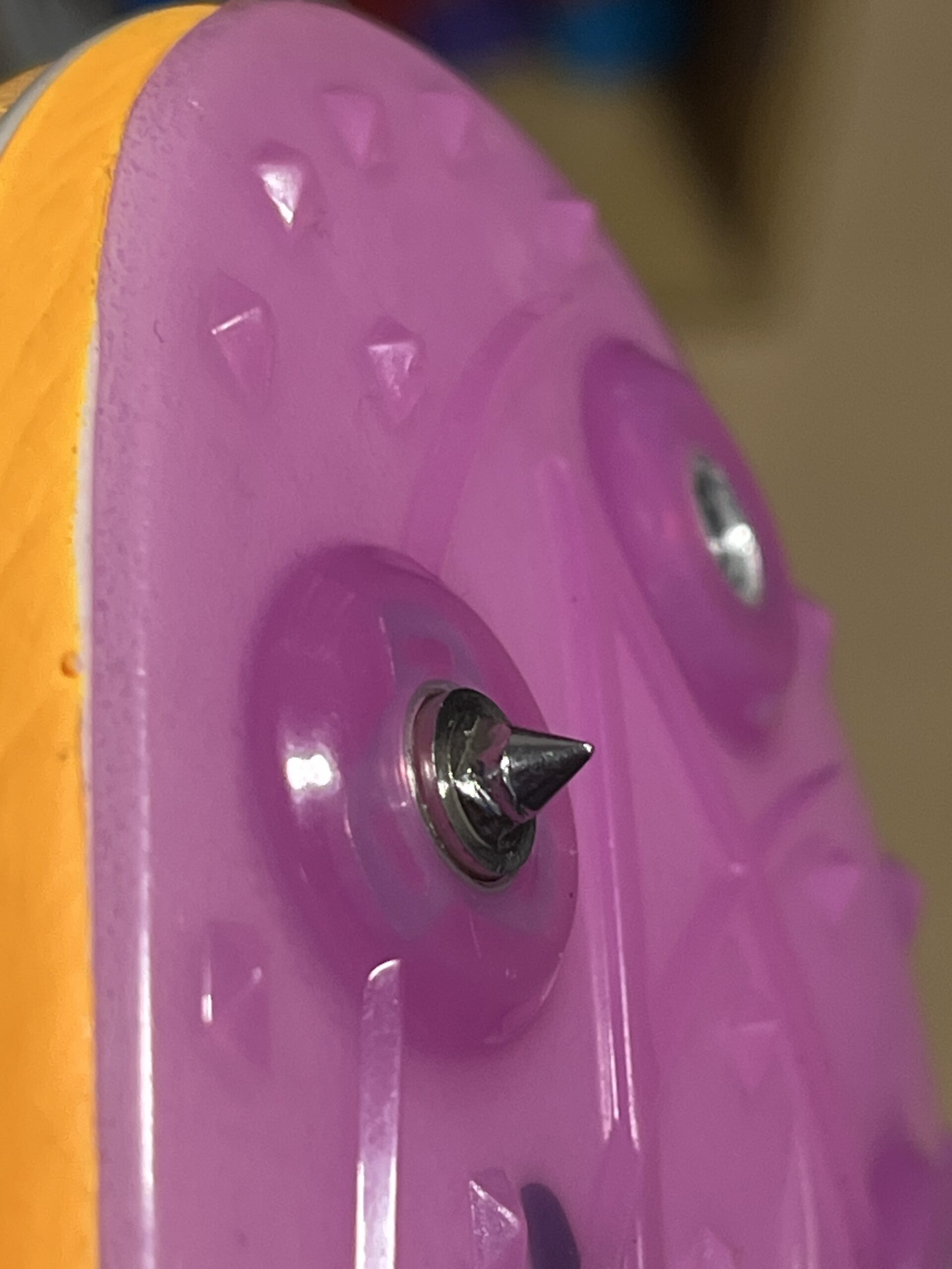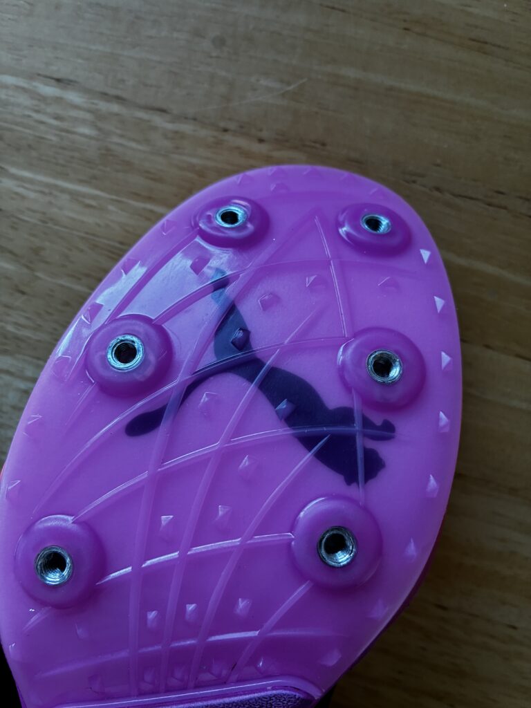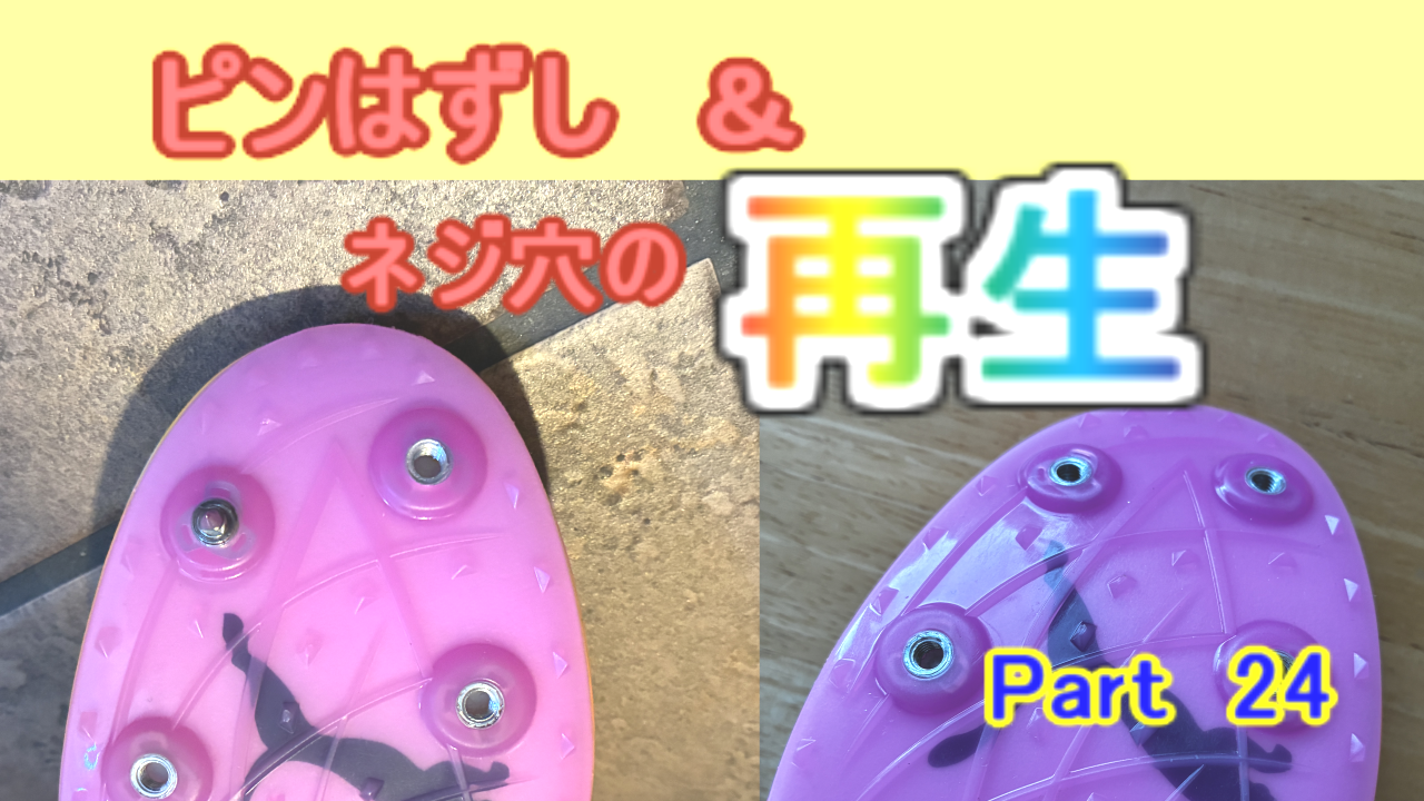 今回は簡単に取れるのではないかと思いましたが、意外に大変でした。ピンを確認するとピン掛かりのところが、削れてしまっているので、ピン掛かりを削って、ネジザウルスで回しましたが、スパイクシューズのネジの出来が悪かったようで、緩んだあともかなり力を入れないと外すことができませんでした。外した後にすべてのネジを確認したところ、4か所がかなり固く、全てのネジをタップで再加工しました。こんなに多くのネジが痛んでいるのは初めてだったので、びっくりしてしまいました。