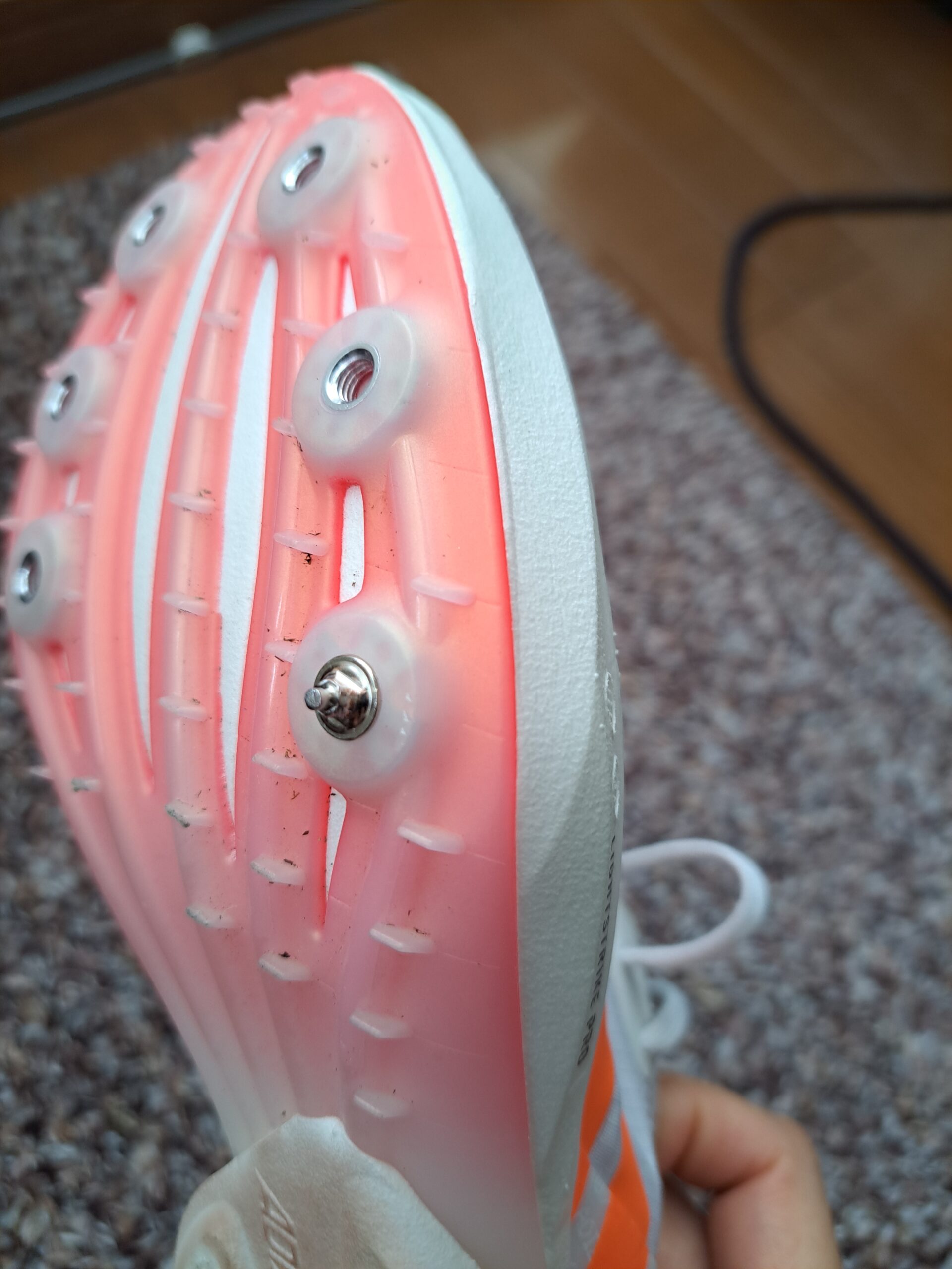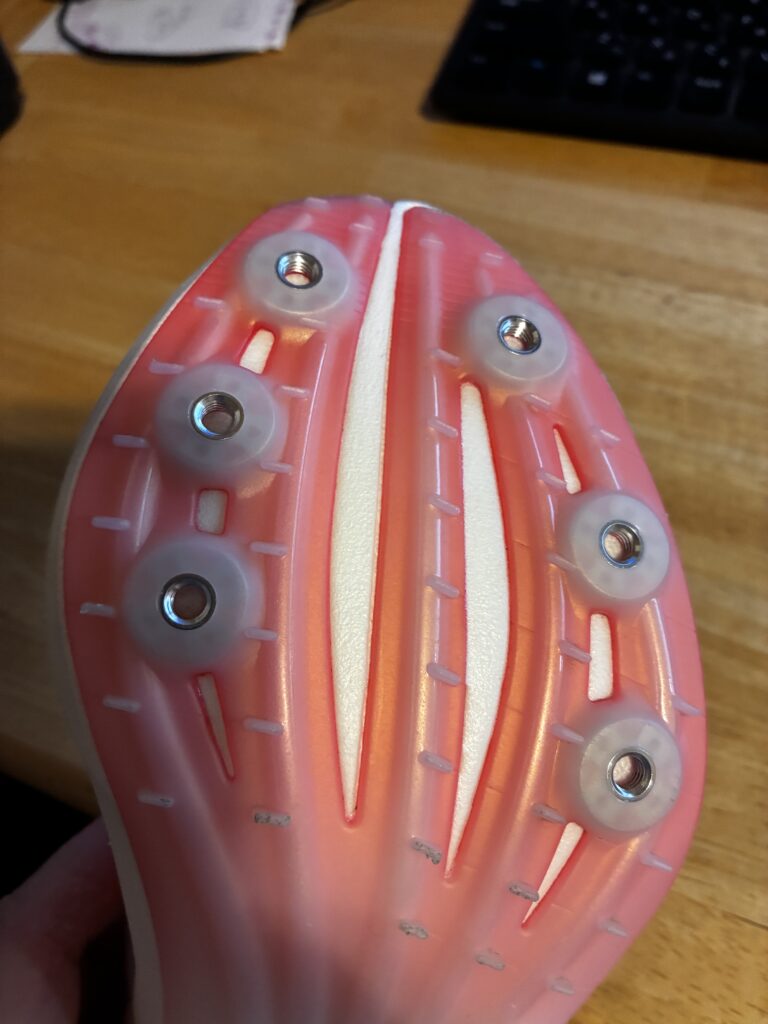 ミズノのU1GZ260100二段平行5ミリのピンです。2月にスパイクを購入した際、お店で勧められたミズノのピンを使用。
